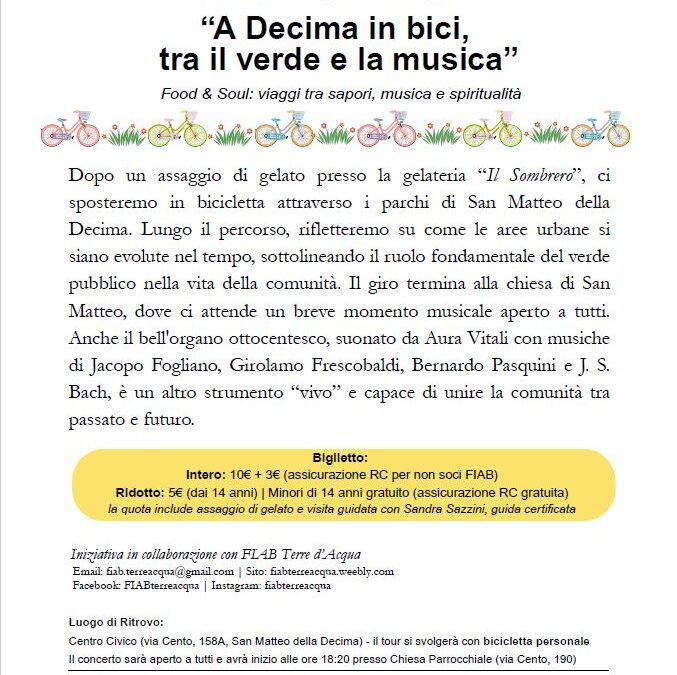 Dopo un assaggio di gelato presso la gelateria “Il Sombrero”, ci sposteremo in bicicletta attraverso i parchi di San Matteo della Decima. Lungo il percorso, rifletteremo su come le aree urbane si siano evolute nel tempo, sottolineando il ruolo fondamentale del verde pubblico nella vita della comunità. Il giro termina alla chiesa di San Matteo, dove ci attende un breve momento musicale aperto a tutti.